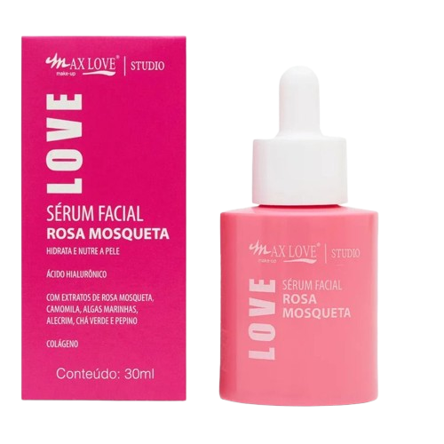 * Sérum Facial Rosa Mosqueta Max Love foi desenvolvidc para promover hidratação e regeneração da pele, além de exercer um efeito anti-inflamatório e antioxidante Sua fórmula ainda é enriauecida com extratos de camomila algas marinhas, alecrim, chá verde e pepino. Também contém colágeno e ácido hialurônico.