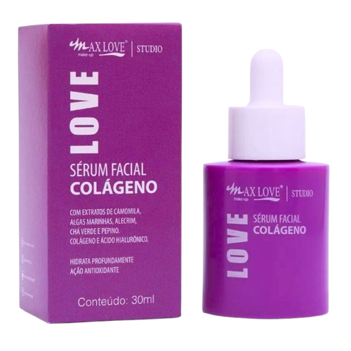 * Sérum Facial Colágeno Max Love foi desenvolvido para auem busca uma aparência de pele mais saudável e iovem Por conta do colágeno em sua composicão, contribui com a saúde da pele, auxiliando no fortalecimento, hidratação e elasticidade. Sua poderosa fórmula somam os efeitos dos extratos de camomila. alaas marinhas. alecrim, chá verde e pepino. O resultado é uma pele mais macia e iluminada